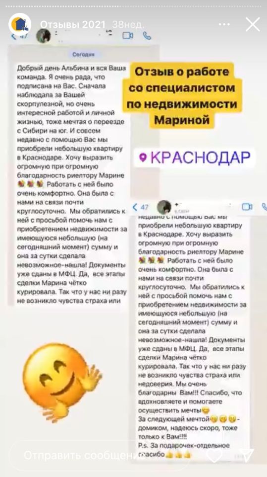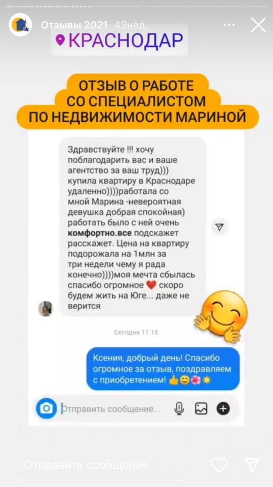 - Я с вами на связи 24 на 7. После начала работы я начинаю жить вашей задачей, ежедневно мониторить рынок недвижимости, искать наилучшие варианты и при этом с вами на связи 24 на 7. Это позволяет найти наилучший вариант из имеющихся на рынке;